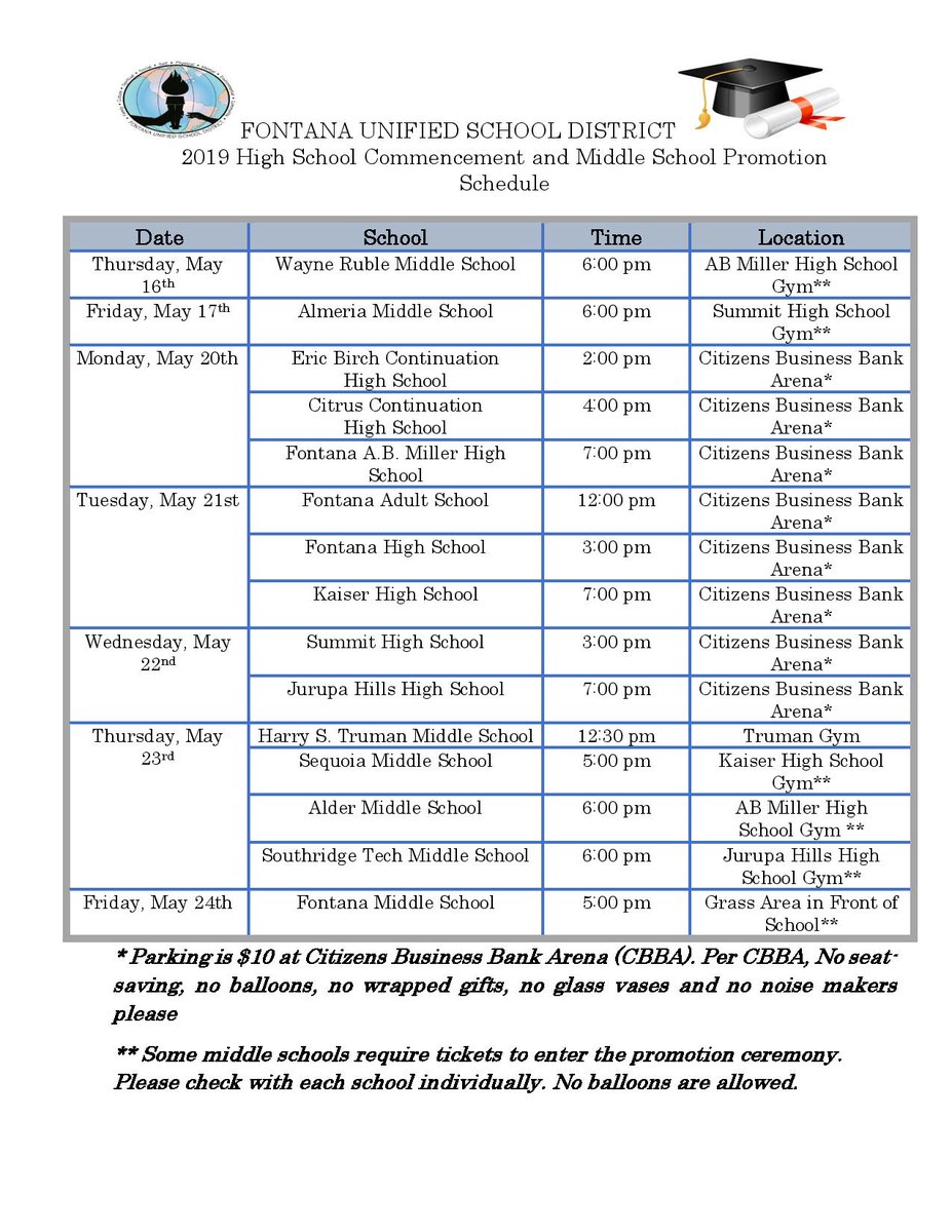 Fontana Unified On Twitter This Week We Celebrate The Next Journey Of Our Students With High School Graduation Ceremonies And 8th Grade Promotions Please See The Attachment For Schedules For All Of Our
