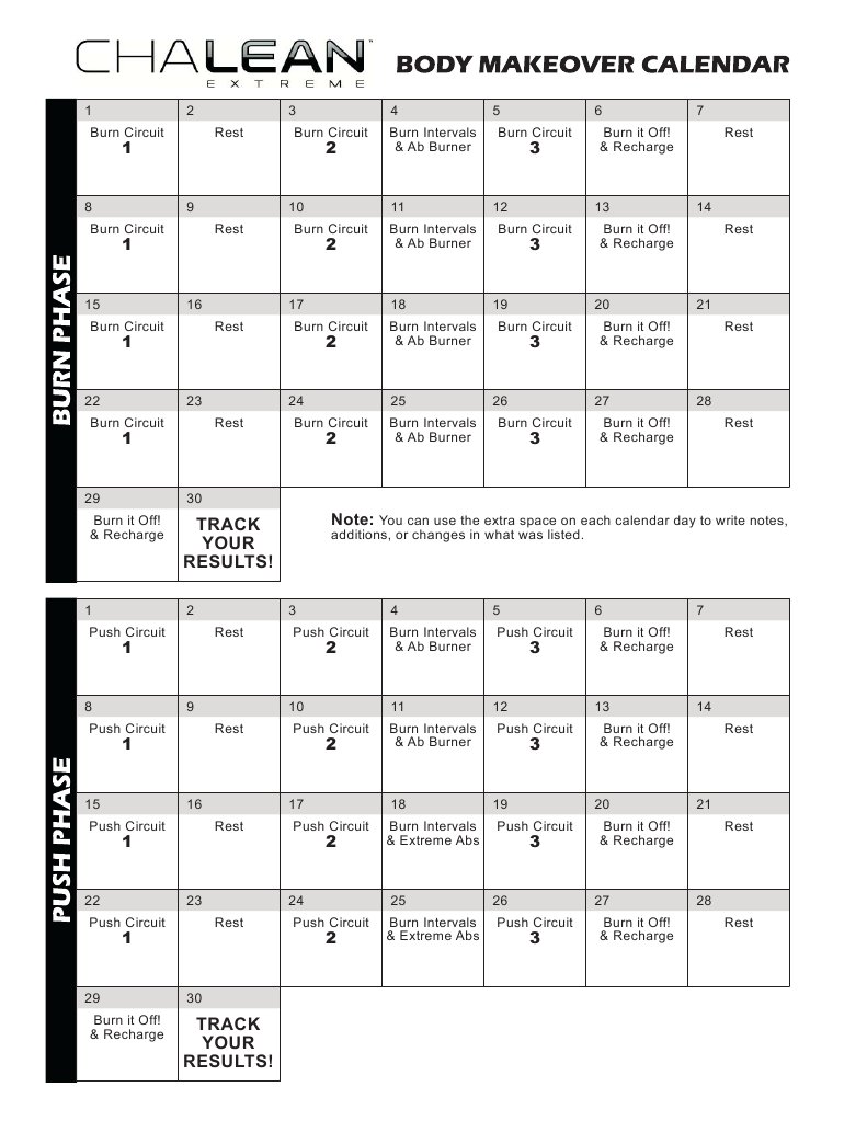 ChaLEAN Extreme Hybrid Calendars. LeAN CIRCUIT 1 Week 1 Week 2 Week 3 Week 4 1 Single-Calf Raise Bicep Curl W_____ R_____ W_____ R_____ W_____ R_____ W_____ R_____. There are two versions of the. Aug 9 2016 - This workout schedule is a ChaLean Extreme and 21 Day Fix hybrid.