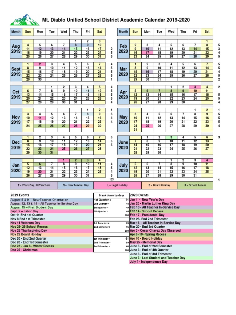 Mt Diablo School Calendar. Diablo Unified School District Academic Calendar 2019-2020. Please check back regularly for any amendments that may occur or consult the Mt. Clayton Ca 94517 925672-0898 Phone 925672-4327 Fax.